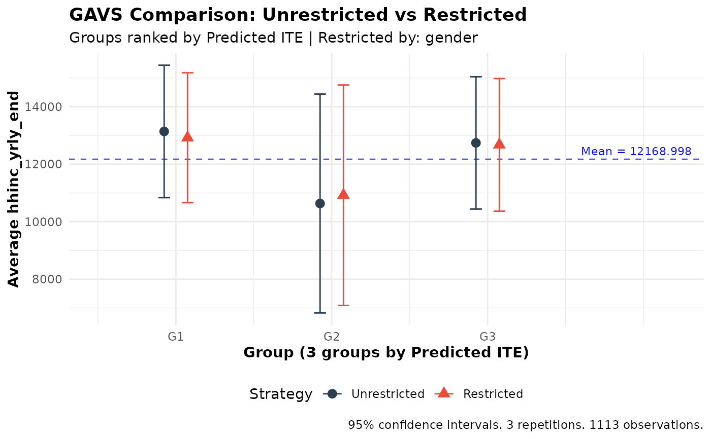 Compares Group Averages (GAVS) between an unrestricted strategy (ranking predictions across the full sample) and a restricted strategy (ranking predictions within groups defined by a restrict_by variable). Both strategies use the **same** ensemble fit — they differ only in how observations are ranked into groups.